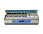 2、装片。将速测卡撕去盖膜对折后再展开,插入压纸条下的各通道加热板上(注意红色药片一端在上方,白色药片一端在下方),检查速测卡放置位置是否正确,速测卡中间的虚线应与压条对齐,不要歪斜。