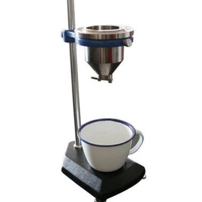 4、在粘度杯漏咀下面放置150mL搪瓷杯,用手指堵住流出口咀后,将被测试样倒满粘度杯中。用试棒将多余之试样割掉在年度杯边缘之凹槽中,(注意:止时试样中不应有气泡产生)然后,移开手指,同时开动秒表,当试样流丝中断并呈现第一滴时,停止秒表,此时秒表所指示的时间即为该产品的全部流出时间,也就是该产品的条件粘度值。
