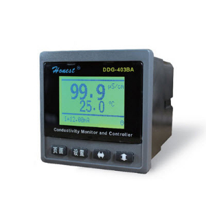 DDG-403BA型智能型电导率监控仪是一台采用单片机进行测量和补偿的智能型电导率测量控制仪器,采用中文菜单式提示操作。具有电导率测量、全自动温度补偿、监视控制功能。本机同时具有标准隔离型4-20mA电流信号输出,电导率上下限报警输出,RS-485通讯接口输出等功能。配套我厂DY-301B型电导(电阻)率打印机,可以实现测量数据的打印记录,广泛适用于电子、化工、制药、机电、核能、饮用水等制水设备工业在线电导率的测量和监控。本仪器采用开孔插入式安装,具有补偿范围宽、测量准确稳定、使用及安装方便等特点,是电导率测量和监控的新一代智能型仪器。