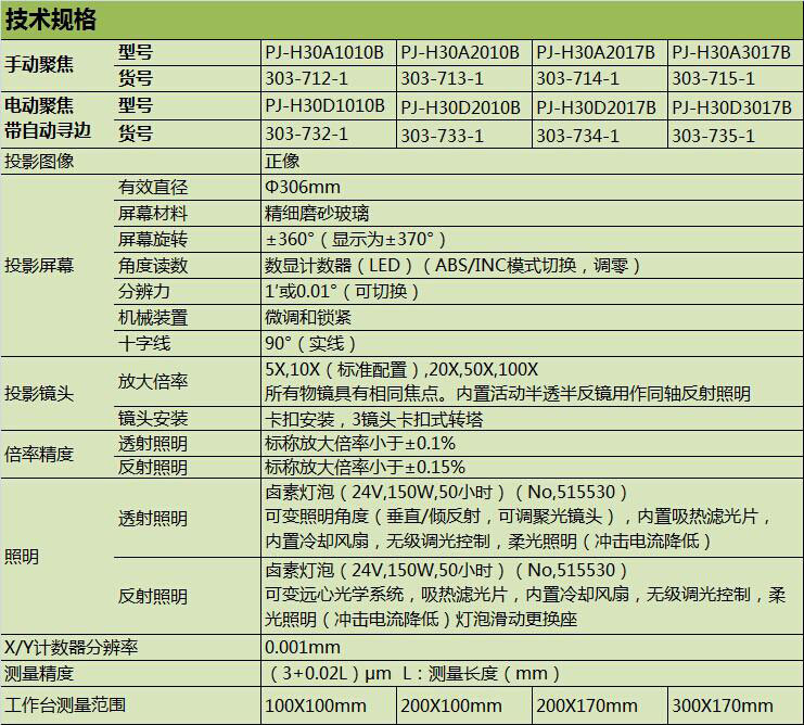 PJ-H30系列投影仪具有(3+0.02L)μm的高测量精度;可通过手动或电动上、